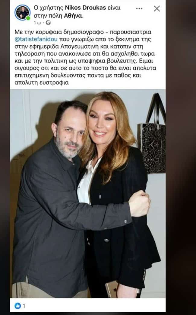 Στη λεζάντα του, ο ίδιος εμφανίζεται απόλυτα σίγουρος ότι η Τατιάνα όχι μόνο ετοιμάζεται να κατέβει στην πολιτική, αλλά θα πετύχει κιόλας όπως άλλωστε έχει κάνει σε κάθε της βήμα μέχρι σήμερα. Με λόγια που στάζουν θαυμασμό, μιλά για το πάθος, την ευστροφία και την επαγγελματική της συνέπεια, αφήνοντας να εννοηθεί ότι η μετάβαση… είναι ήδη ειλημμένη απόφαση.