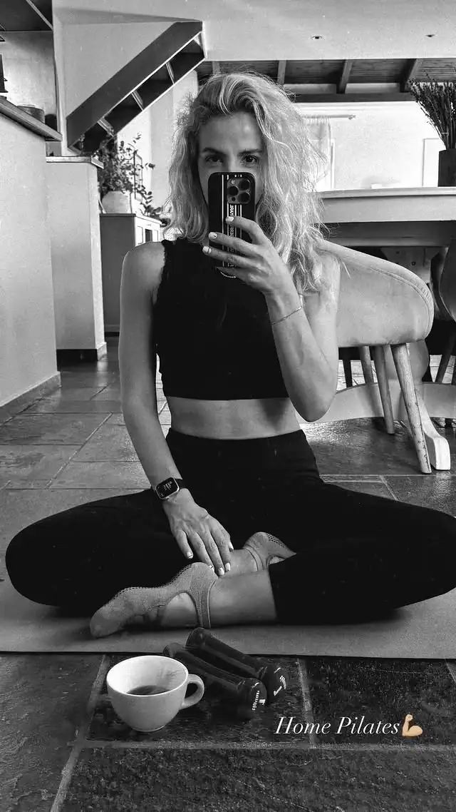 Όταν δεν απολαμβάνει το πρωινό της, η Τζένη αφιερώνεται στη γυμναστική. Πρόσφατα έκανε την αγαπημένη της προπόνηση pilates, φορώντας άνετα ρούχα και έχοντας το ρόφημά της δίπλα της. Στιγμές χαλάρωσης και αυτοφροντίδας, με τα μαλλιά της να πέφτουν χαλαρά στους ώμους, δημιουργώντας φυσικούς κυματισμούς που ολοκλήρωναν τη γαλήνια ατμόσφαιρα.