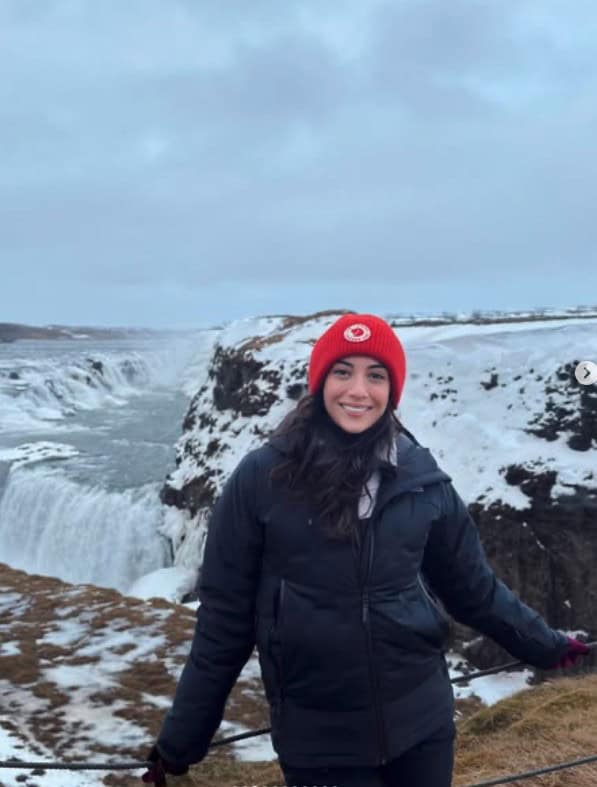 Παράλληλα, επισκέπτεται μερικά από τα πιο γνωστά σημεία της χώρας, όπως τους Skógafoss, Kvernufoss, Gullfoss και Seljalandsfoss, και μοιράζεται στιγμές από το ταξιδιωτικό της πρόγραμμα.