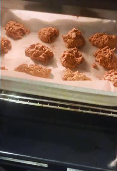 - Απλώνουμε λαδόκολλα σε ένα ταψί και με ένα μεγάλο κουτάλι προσθέτουμε μια κουταλιά από το μείγμα για κάθε μπισκότο. Πιέζουμε τα μπισκότα ελαφρώς.