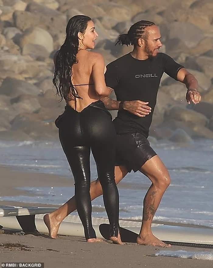 Η 45χρονη σταρ των ριάλιτι φορούσε ένα μπικίνι τοπ και μια μαύρη στολή κατάδυσης με ανοιχτό φερμουάρ στη μέση της, ενώ ο 41 ετών οδηγός της Φόρμουλα 1 φορούσε σορτς κι ένα μπλουζάκι. Οι δυο τους φωτογραφήθηκαν επίσης δίπλα δίπλα στα κύματα πριν ο Χάμιλτον πετάξει τη σανίδα του στη θάλασσα για μια βόλτα.