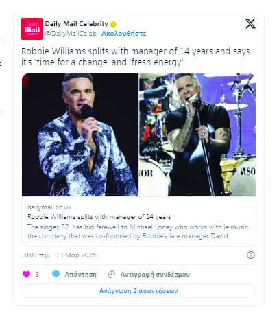 Ο Ρόμπι Γουίλιαμς απέλυσε τον μάνατζέρ του μετά από 14 χρόνια: «Χρειάζεται φρέσκια ενέργεια»