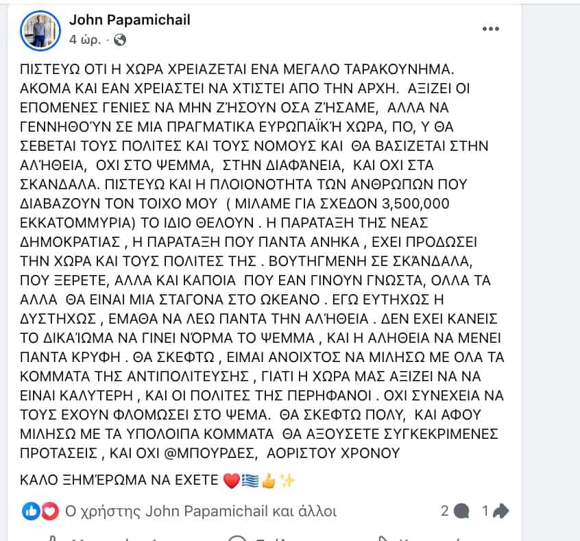 “Πιστεύω ότι η χώρα χρειάζεται ένα μεγάλο ταρακούνημα. ακόμα και εάν χρειαστεί να χτιστεί από την αρχή. αξίζει οι επόμενες γενιές να μην ζήσουν όσα ζήσαμε, αλλά να γεννηθούν σε μια πραγματικά ευρωπαϊκή χώρα, που θα σέβεται τους πολίτες και τους νόμους και θα βασίζεται στην αλήθεια, όχι στο ψέμα, στη διαφάνεια και όχι στα σκάνδαλα. Πιστεύω και η πλειονότητα των ανθρώπων που διαβάζουν τον τοίχο μου (μιλάμε για σχεδόν 3.500.000) το ίδιο θέλουν. η παράταξη της νέας δημοκρατίας, η παράταξη που πάντα ανήκα, έχει προδώσει τη χώρα και τους πολίτες της. βουτηγμένη σε σκάνδαλα, που ξέρετε, αλλά και κάποια που εάν γίνουν γνωστά, όλα τα άλλα θα είναι μια σταγόνα στον ωκεανό. εγώ ευτυχώς ή δυστυχώς, έμαθα να λέω πάντα την αλήθεια. δεν έχει κανείς το δικαίωμα να γίνει νόρμα το ψέμα και η αλήθεια να μένει πάντα κρυφή. θα σκεφτώ. είμαι ανοιχτός να μιλήσω με όλα τα κόμματα της αντιπολίτευσης, γιατί η χώρα μας αξίζει να είναι καλύτερη και οι πολίτες της περήφανοι. όχι συνέχεια να τους έχουν φλομώσει στο ψέμα. θα σκεφτώ πολύ και αφού μιλήσω με τα υπόλοιπα κόμματα θα ακούσετε συγκεκριμένες προτάσεις και όχι @μπουρδες αορίστου χρόνου”.