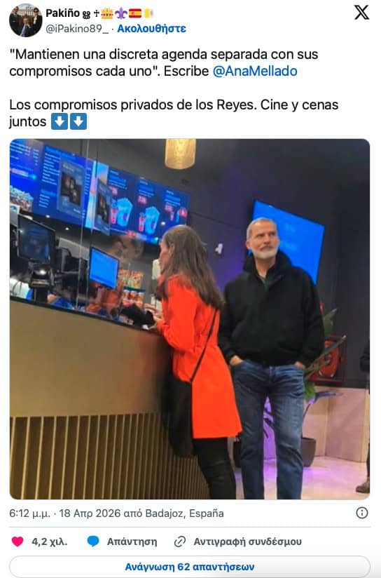 Στο στιγμιότυπο, το βασιλικό ζευγάρι βρίσκεται σε κινηματογράφο, περιμένοντας στο ταμείο για να αγοράσει αναψυκτικά και ποπ κορν. Η βασίλισσα Letizia φαίνεται να συνομιλεί με τον υπάλληλο, ενώ ο βασιλιάς Felipe στέκεται λίγο πιο πίσω, χαλαρός και διακριτικός. Η εικόνα αυτή δημοσιεύτηκε από ισπανικά μέσα και γρήγορα έκανε τον γύρο του διαδικτύου.