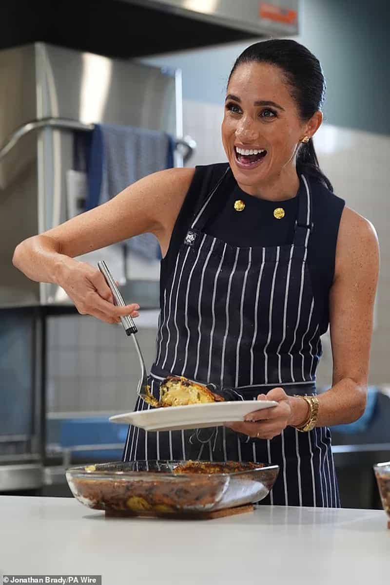 Η Μέγκαν, η οποία φορούσε ένα μπλε φόρεμα αξίας 720 ευρώ της σχεδιάστριας με έδρα το Σίδνεϊ Κάρεν Τζι, βοήθησε αργότερα στο σερβίρισμα του γεύματος σε ξενώνα φιλοξενίας κακοποιημένων γυναικών στην πόλη.