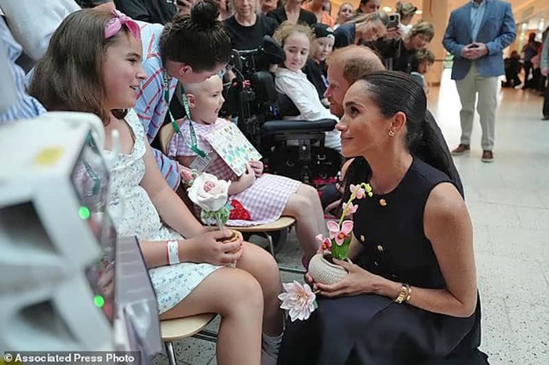 Ο Χάρι, φορώντας ένα μπλε κοστούμι και λευκό πουκάμισο, μίλησε με παιδιά και πόζαρε για φωτογραφίες με ασθενείς στον προθάλαμο του νοσοκομείου χαρακτηρίζοντας «όμορφη» μια χειροποίητη πινακίδα για την υποδοχή του ζεύγους.