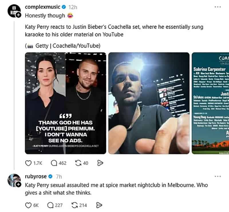Από την πλευρά της, εκπρόσωπος της Κέιτι Πέρι έχει απορρίψει κατηγορηματικά τις καταγγελίες, κάνοντας λόγο για «επικίνδυνα και ψευδή ψέματα», τονίζοντας ότι οι ισχυρισμοί αυτοί είναι αβάσιμοι. Η ηθοποιός προχώρησε στην καταγγελία απαντώντας σε ανάρτηση του ιστοτόπου «Complex» σχετικά με την αντίδραση της Πέρι στην εμφάνιση του Τζάστιν Μπίμπερ στο «Coachella». Συγκεκριμένα έγραψε: «Η Κέιτι Πέρι μου επιτέθηκε σεξουαλικά στο νυχτερινό κλαμπ Spice Market στη Μελβούρνη. Ποιος νοιάζεται τι πιστεύει».